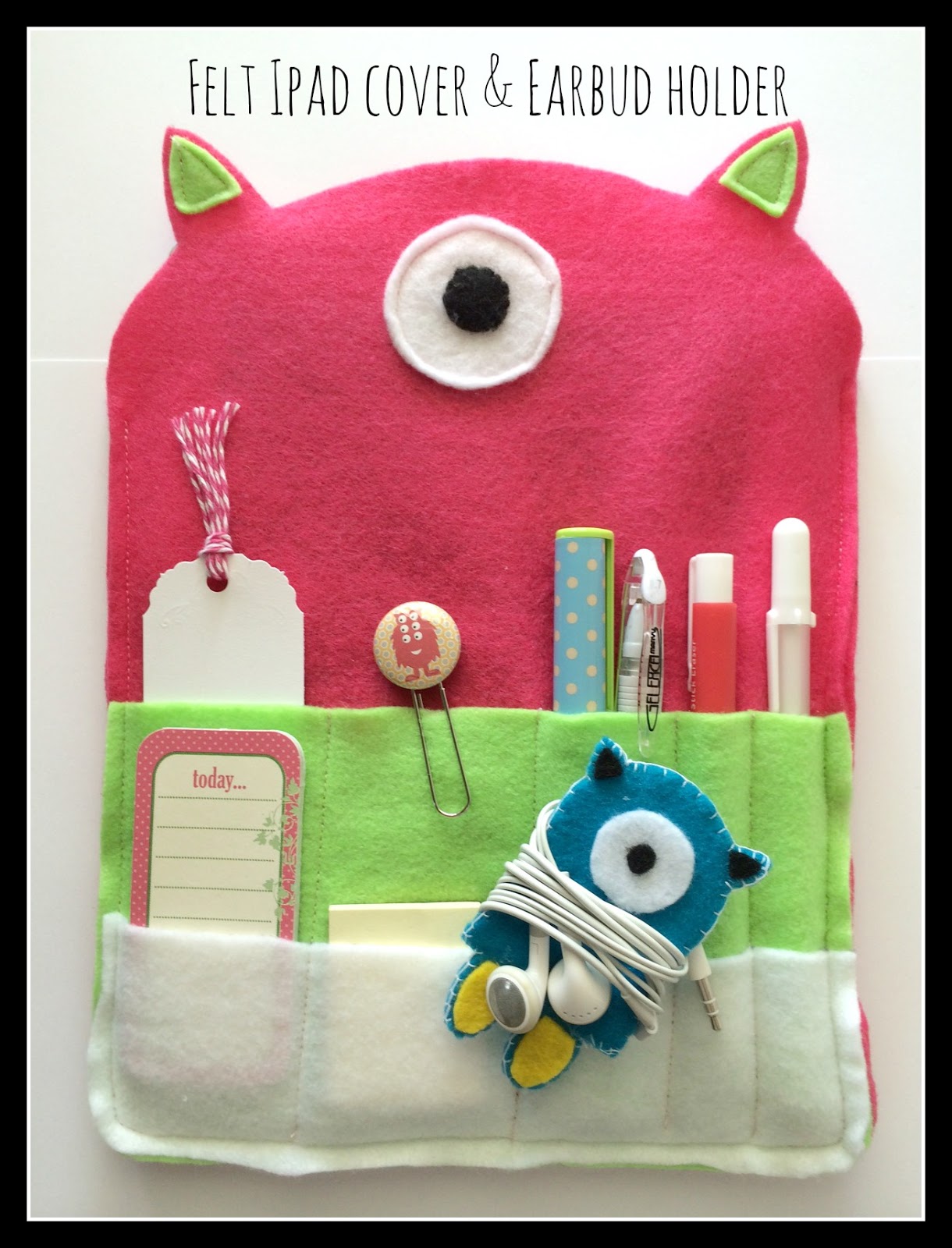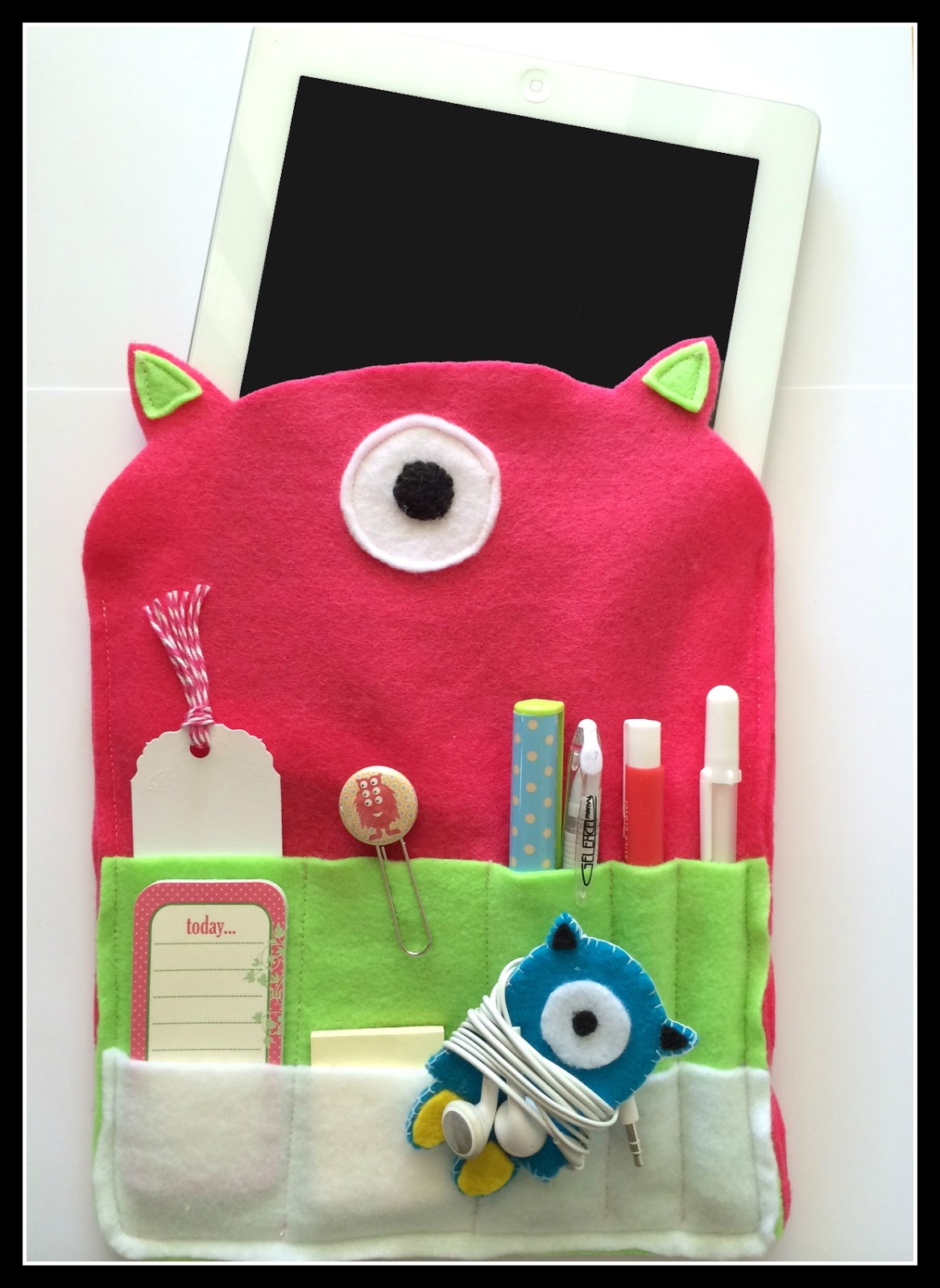 Right now in our Silhouette Shop at Silhouette Online many of our fabric die cuts are on sale for .69 cents! Deborah from Craftin’ Chaos has taken the Monster Pencil Case and done her own twist with it that you will love. She has also included a tutorial below on how to create this fun Felt Ipad Cover & Earbud Holder! ~Susan